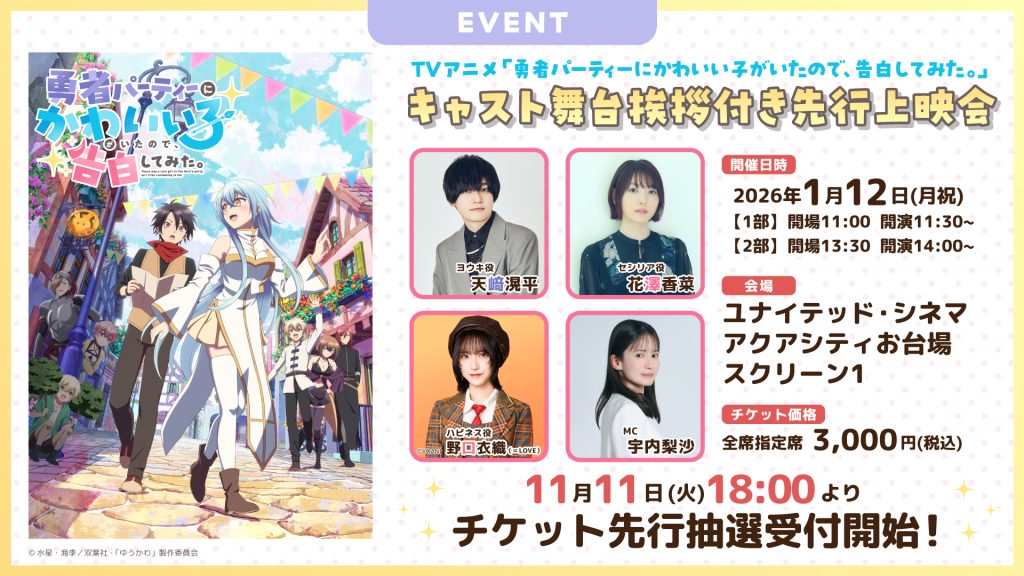 TVアニメ『勇者パーティーにかわいい⼦がいたので、告⽩してみた。』のキャスト舞台挨拶付き先行上映会の開催が決定いたしました!