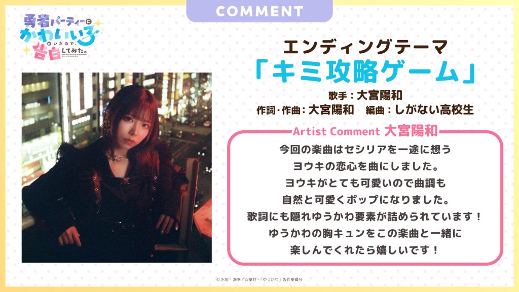大宮陽和が、2026年1月6日(火)より放送開始となるTVアニメ『勇者パーティーにかわいい子がいたので、告白してみた。』のエンディングテーマを担当することが決定いたしました。楽曲タイトルは「キミ攻略ゲーム」。