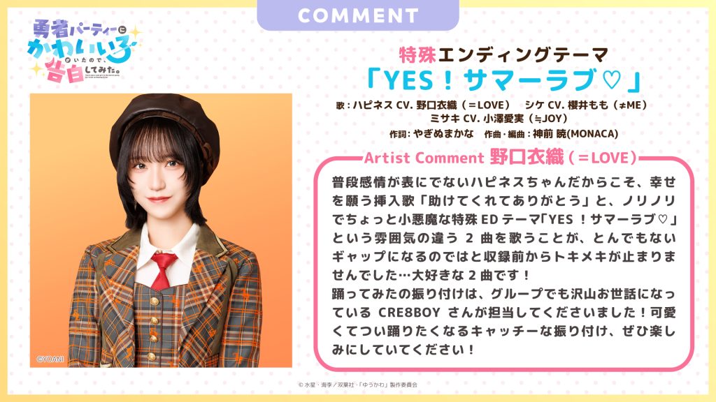 ハピネス役 野口衣織(=LOVE)さん、シケ役 櫻井もも(≠ME)さん、ミサキ役 小澤愛実(≒JOY)さんの3名で歌唱する特殊エンディングテーマ「YES!サマーラブ♡」の配信が決定