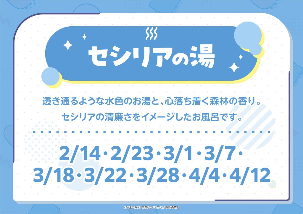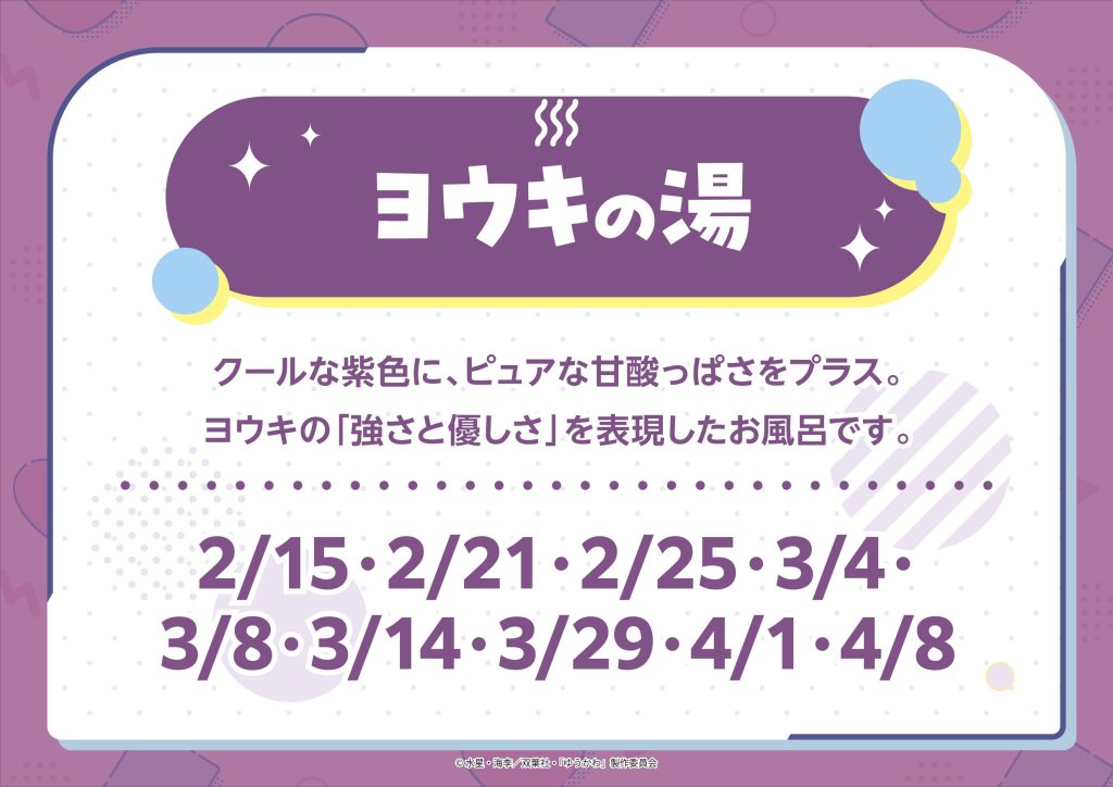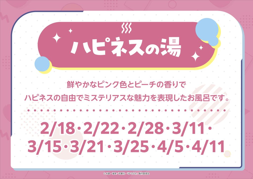 期間中、「ゆうかわ」をイメージした3種類の特別なお風呂が日替わりで登場します。特別な入浴体験をお楽しみください。